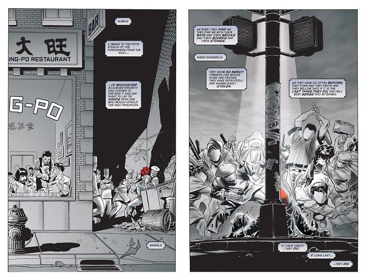 Aquellas dos páginas mostraban a Red Skull siendo golpeado violentamente por extranjeros. A su vez, los cambios en los textos dejan de lado todas las menciones más racistas, incluyendo llamar por su nombre a chinos, japoneses y africanos. Toda la reescritura le baja el tono de odio racial a los pensamientos del villano. Por otro lado, en el guión original el Capitán América aparece como el líder del partido que ocupa el poder y es retratado con muchísimos paralelismos con el propio Hitler, llegando hacia la escena final donde se repite la secuencia del comienzo en la que Red Skull se da a conocer frente al führer. Esto es modificado de forma que los paralelismos se pierden en los textos y quedan sólo en el dibujo.