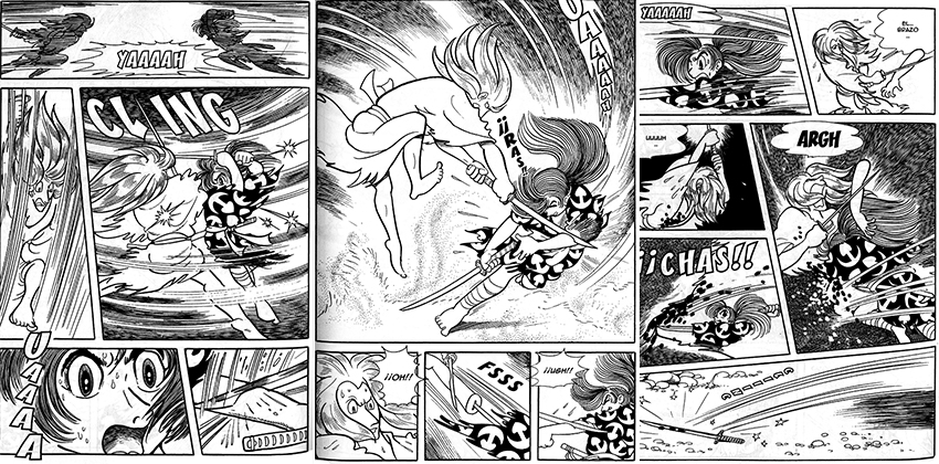 En las escenas de acción, las cuales son muchas y se disfrutan muchísimo, y siempre es protagonista Hyakkimaru, el autor usa distintas combinaciones de planteamiento de la página, con viñetas poco convencionales, lo que produce sensación de velocidad, acompañadas de silencios u onomatopeyas que representan los sonidos de los golpes o movimientos de los personajes (o alguna extremidad cortada). Todo esto, además, le agrega más densidad a la escena, ya que nos hace sentir que realmente la batalla es a vida o muerte, con graves lesiones de por medio, y se disputa con toda seriedad.