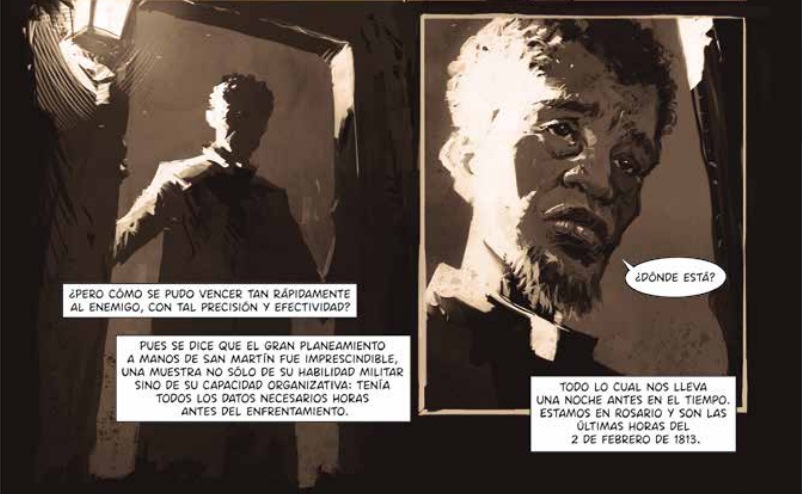 - Nicolás Di Mattia: Otro que aporta algunas viñetas deslumbrantes dentro de un estilo de iluminación crepuscular super atractivo. Un día antes de la Batalla de San lorenzo, San Martín tiene que encontrarse en una pulpería con un cura que le dará la información necesaria para planificar el ataque. Pero los enemigos lo saben y lo esperan emboscados. ¿Cómo hará nuestro héroe para entrar y salir?