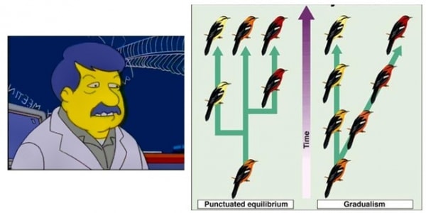 Esta frase que pronuncia el Professor X en el cine describe el origen de los mutantes como un salto (“leaps”). Cuando escribió su famoso libro, Darwin propuso un mecanismo evolutivo que llamó Selección Natural. Este mecanismo implica que la evolución es dirigida a partir de la acumulación de pequeños cambios dados por la presión de grandes cambios en el ambiente (por ejemplo el clima, la aparición de predadores, el surgimiento de fuentes de alimento) sobre poblaciones de alguna especie. La evolución que ocurre bajo este mecanismo es denominada “gradual” y el conjunto de teorías que se desprenden del mismo recibe el nombre de Gradualismo. Esta es la teoría evolutiva que se enseña en escuelas, libros de texto, etc. y es la más difundida. Hacia fines de la década de 1970, un grupo de paleontólogos liderados por Stephen J. Gould (el paleontólogo que inspecciona al “ángel” en Los Simpsons, episodio “Lisa the skeptic“) propuso una teoría alternativa que se denominó Saltacionismo. Dentro de este marco, la evolución podría ocurrir a “saltos”, o sea, en tiempos breves. Los partidarios del Saltacionismo explican que muchos cambios pueden acumularse en tiempos relativamente breves (hablamos de tiempos geológicos breves, lo que puede ser unos pocos miles de años, en lugar de los millones de años que necesitaban los gradualistas) y dar esos saltos. Dado que los primeros mutantes habrían aparecido muy repentinamente en la historia, podemos atribuir el origen de la especie mutante a un proceso saltacionista.