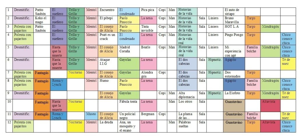 Cuarto: Los colores son puramente orientativos y sirven como una guía visual rápida. No tienen ningún otro significado. La idea es que si un título aparece de un color en un cuadro, mantenga el mismo color (más o menos) en los otros cuadros en que aparezca.