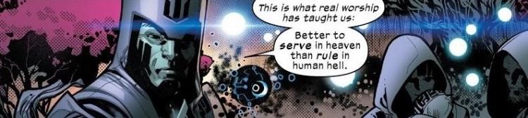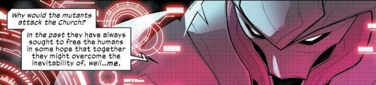 Conocemos más detalles sobre el tema de la ascensión que atestiguamos en el número anterior, en este caso con la inclusión de la Church of Ascendancy. La humanidad es imperfecta, y necesita de la tecnología para evolucionar, ya que rechaza a la naturaleza que engendró a los mutantes. Este tipo de conflicto es un excelente punto de quiebre para el eterno enfrentamiento entre humanos y mutantes que tanto conocemos, puesto que ahora la humanidad es irrelevante y la disputa se centra entre los verdaderos reemplazos de la misma: los herederos artificiales (tecnología) o los herederos biológicos (mutantes). Nimrod deja claro que le importa poco la humanidad, y ese es un punto vital.