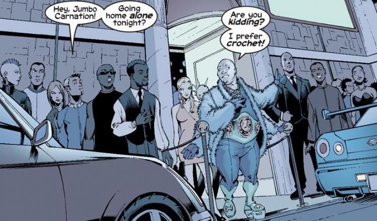 Hablando de moda, el regreso de un mutante que fue reducido en su mejor momento. Flores. Jumbo Carnation es un mutante creado por Grant Morrison, que muere por sobredosis de Kick (aunque fue atacado por humanos y se pensó que esa fue su muerte). Jumbo Carnation era un diseñador de moda en su pico más alto de popularidad. Carnation significa clavel, una flor. Así como varios mutantes que murieron hace poco y ahora están vivos… Jumbo puede ser uno de los que vuelven.