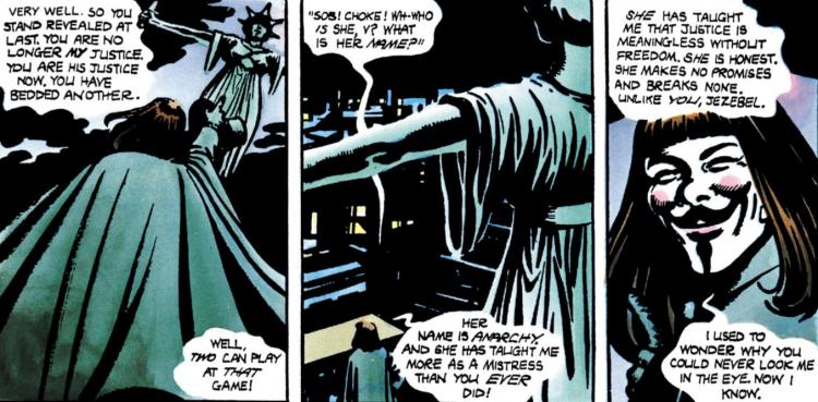 En un monólogo muy interesante, V frente a la estatua que representa a la justicia, le habla como si se tratase de su amante. La degrada llamándola Jezabel (esposa del rey Ahab de Israel en La Biblia, una mujer inmoral que rendía culto a demonios). Le explica que supo amarla, pero que ahora ella lo engaña con otro. La Justicia sirve a quien está al poder, no es verdadera justicia sin libertad. V entonces, dice que conoció a otra mujer, mejor que Justicia: Anarquía. Ella le enseñó que la justicia no tiene sentido sin libertad. Es honesta, no hace promesas ni las rompe. Como regalo de despedida, V detona una bomba que destruye a la Justicia.