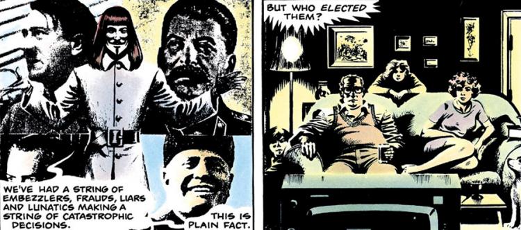 V, en televisión, dice: «Tuvimos fraudes, mentirosos, lunáticos, impostores y aprovechadores tomando decisiones catastróficas una tras otra. Esto es así. Pero ¿quién los eligió?». La interpelación de V es con el público, que sigue en una jaula repitiendo los mismos errores, insistiendo siempre en la misma historia de votar líderes. El líder, como representación perfecta del fascismo, en contraposición a la falta de líderes, que es lo que comulga la Anarquía.