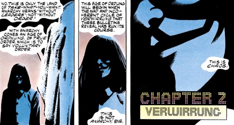 Cuando inician las manifestaciones, los levantamientos sociales, Evey le pregunta a V: «Esto es la anarquía, la “Tierra de hacer lo que quieras?“» Y V, para dejar en claro el punto de que simplemente hacer cualquier cosa porque no hay un estado que te controle no implica anarquía, explica: «No, esto es la “Tierra de tomar lo que quieras”. La anarquía singifica “sin líderes”, no “sin orden”. Con la anarquía viene la Era de Ordnung, del verdadero orden, lo que significa el orden voluntario. Esta era de Ordnung va a comenzar cuando el incoherente y demente ciclo de Verwirrung que estamos transitando, termine. Esto es caos».