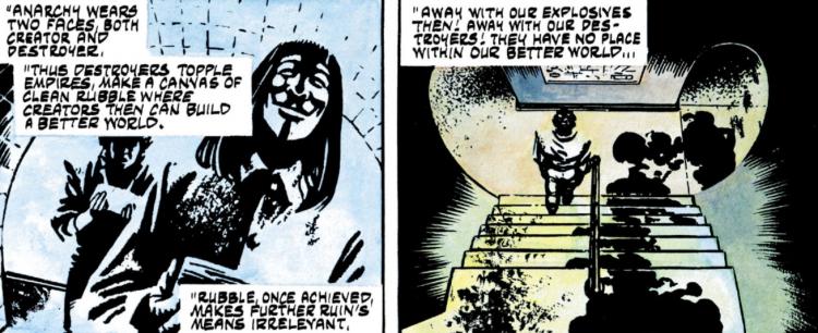 La anarquía porta dos caras, creador y destructor. Los destructores derriban imperios, hacen un lienzo de escombros limpios donde los creadores pueden construir un mundo mejor. Los escombros, una vez logrados, hace irrelevante dejar más ruinas. ¡Fuera explosivos! ¡Fuera destructores!, no tienen lugar en nuestro mundo mejor“. – V