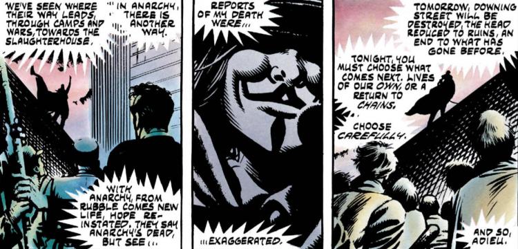 Hay muchos tipos de anarquía, y dudo que la idea de Moore sea encasillar a V en la Anarquía Socialista, la Anarquía sin adjetivos o la Anarquía Insurreccionalista (que, a mi parecer, son las más marcadas en el personaje). Hay un poco de todo, y el autor prefiere ir por una anarquía “en crudo”, digamos.