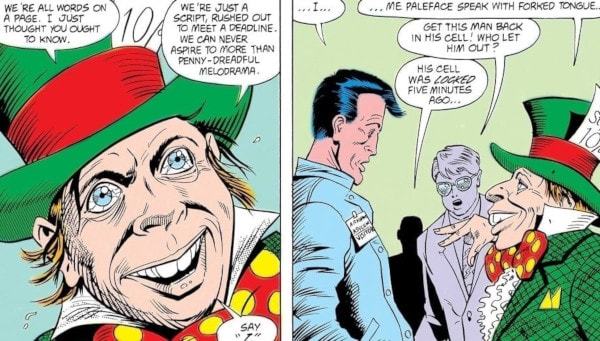 Otra frase en latín es “Tempus Fugit” frase que también utiliza Lewis Carroll en su obra Alicia en el País de las Maravillas (Novela que debe ser del agrado del pela porque, al igual que en Batman Arkham Asylum, utiliza tambien a Mad Hatter para plantearnos cuestiones relevantes que nos dejan pensando sobre la realidad). El Mirror Master (ya vamos a nombrarlo más adelante), agarra un espejo cuya marca es “Carroll & Co.”. Y más adelante mencionan “Through the looking glass” cuando Highwater encuentra el libro…