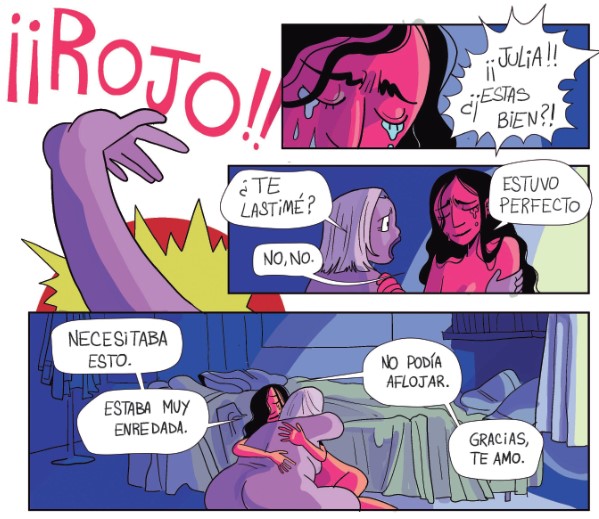Por otro lado, es genial que entre todo esto esté una guía sobre cómo usar cinturongas ya que, desde las primeras historietas, es un elemento que se ve y se utiliza con pasión. Esta es una colaboración con Kinky Vibe: “Un emprendimiento autogestivo disidente, con una tienda erótica y de cuidados, así como una Editorial y un espacio virtual de formaciones”. Muy copado para pegarte un lindo viaje por el BDSM y agarrarle la mano a la plenitud del garche o la autoexploración con muchos recursos piolas.