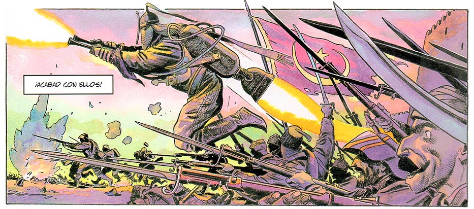 Mover la acción del frente europeo permite tener una mejor perspectiva de la dimensión “mundial” del conflicto (como, brillantemente, hizo Hugo Pratt en Los Escorpiones del Desierto). Acá vemos combatir a los ejércitos coloniales canadienses, neozelandeses y australianos, y también se llega a mostrar como la gran guerra era aprovechada localmente para disimular otras atrocidades, como la masacre del pueblo armenio a manos de los turcos.