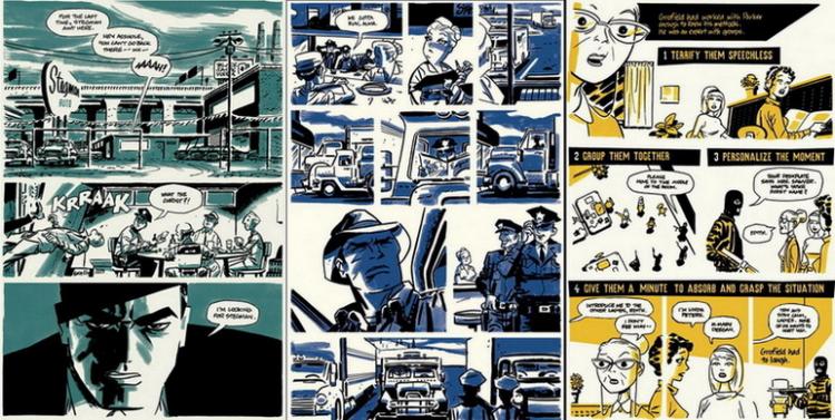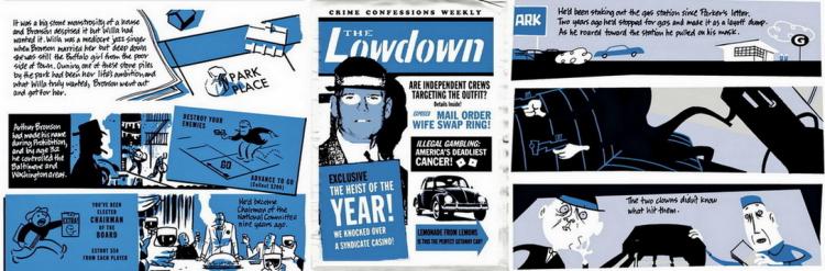 Cooke baja un poco con la cantidad de recursos empleados, y sólo cambia el registro cuando el argumento lo requiere. Si bien la historia es más lineal, y todo es declarado en la fase del plan como para tener una guía, la cantidad de personajes la complejiza y le agrega texturas. Se destaca el reparto tan heterogéneo que construye Cooke (donde destaca un personaje muy, muy parecido a Jim Steranko). Como dato extra: Es el preferido del propio Darwyn Cooke.