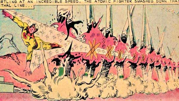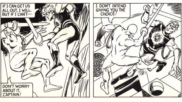 Hagamos un repaso de los poderes del héroe nuclear, porque ciertamente los guionistas no lo hicieron nunca: además de volar y la clásica super-fuerza, también puede emanar calor a voluntad y atravesar cualquier cosa. Bueno, en esta nueva serie a todo eso hay que sumarle lo que sea que se le ocurra a Joe GillDavid Kaller y Steve Ditko para hacer avanzar la trama, y eso incluye tirar bolas de fuego, hacerse invisible, curar a alguien a quien le habían lavado el cerebro y alterar la ingeniería de una nave espacial con telepatía. A veces inventan una excusa como “emanando calor puedo hacer esto”, pero en otras solo puede porque sí.