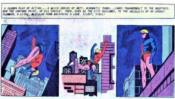 En el #56 se nota que no sabían con qué rellenar la aventura (y eso que la revista la comparte con un back-up de 10 páginas de unos héroes llamados “The Sentinels”) porque Peter y Tabu se pasan dos páginas recordando aventuras pasadas. Prácticamente toda la serie está manejada por Pete Morisi excepto los números #57 y #59, en los que Pat Boyette toma la posta en números donde se ve que PAM no llegaba a la fecha de entrega. En estos números el artista invitado aprovecha y mete pequeñas rupturas de la cuarta pared burlándose de los editores y le inventa a Thunderbolt el poder místico de crear seres mágicos con su imaginación que, por suerte, no volvió a usar nunca.