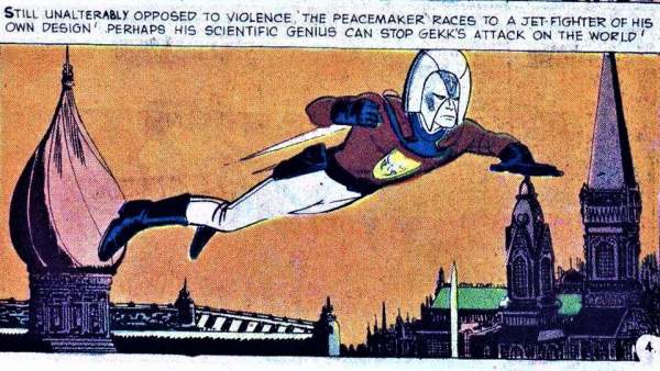 Creado por Joe Gill y Pat BoyettePeacemaker es un héroe que, como dice su frase gatillo, ama la paz. Ama mucho la paz como concepto abstracto, signifique lo que signifique, y va a ponerse un traje sacado de un cómic de Jack Kirby con mochila propulsora y muchas armas no-letales para defenderla. Peacemaker es el alter ego de Cristopher Smith, un diplomático muy honesto que aborrece la violencia, por lo que ponerse el traje de superhéroe para él es una tortura. Si Thunderbolt no quería salir a ser héroe porque le daba paja, a Peacemaker le va a doler en carne propia tener que responder a la violencia con más violencia, pero a veces, para él, no hay otra solución.