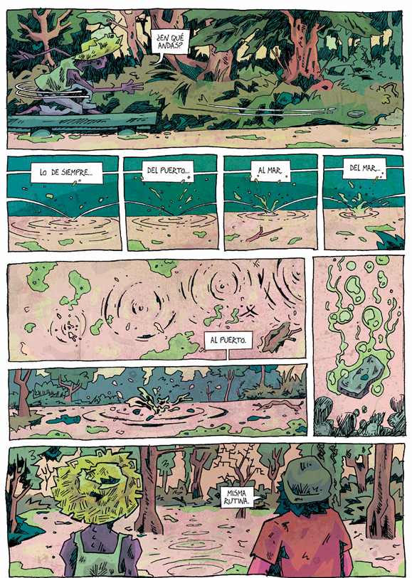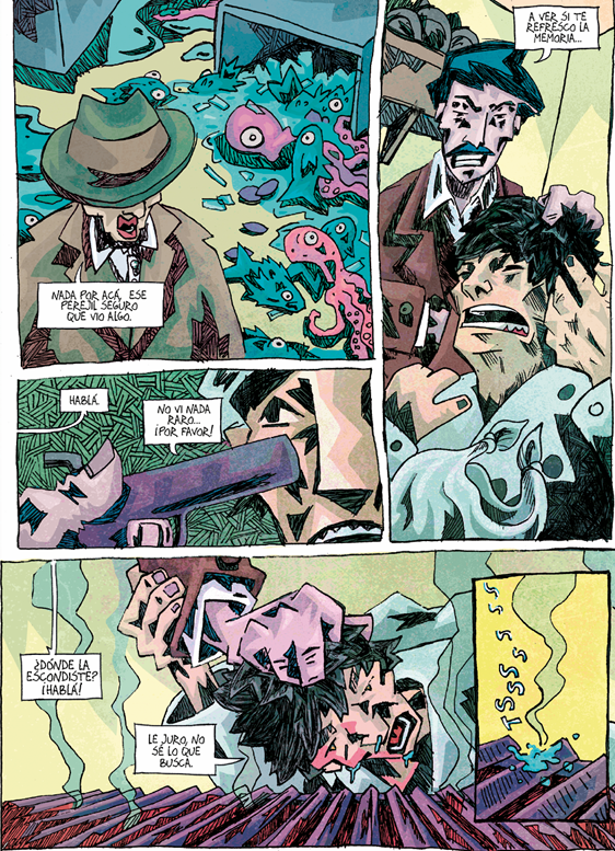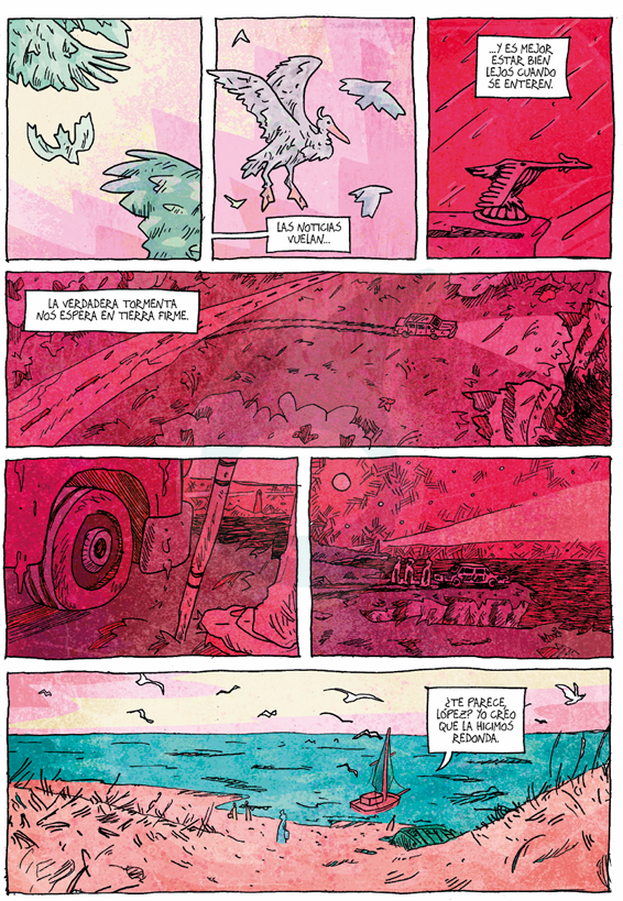 También muestra con mucha maestría los cambios de sintonía en las escenas, utilizando diversas paletas de colores, donde en algunos casos se luce con momentos de psicodelia, como en las pesadillas que persiguen a Lopez. Mientras en otros nos brinda, en solo una página, el proceso que lleva de la pesca hasta el momento en que sirven la comida ya lista en un restaurante, demostrando gran capacidad para la elipsis y el avance de la trama.