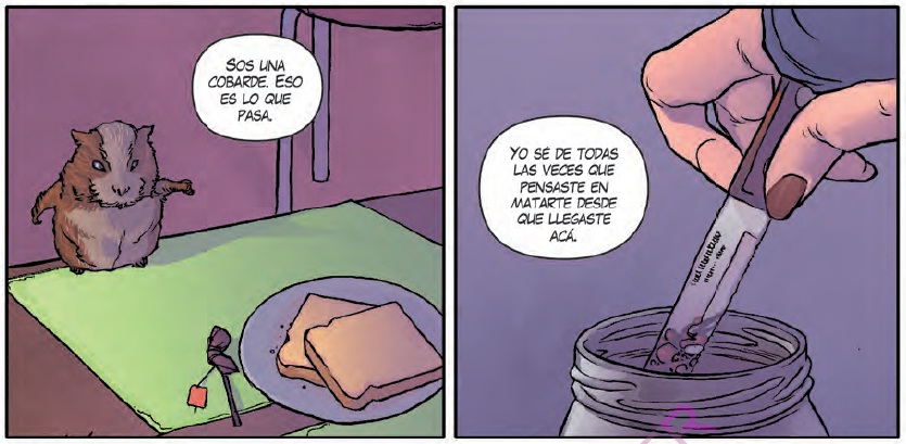 Respecto del color digital, la paleta viene dada por un predominio de unos tonos violáceos apagados y se mantiene muy coherente durante todo el libro. No es un color plano pero tampoco está lleno de brillitos y efectos que distraigan la lectura. Realmente es un gran trabajo de coloreado que se nota pensado y resuelto en función de la obra.