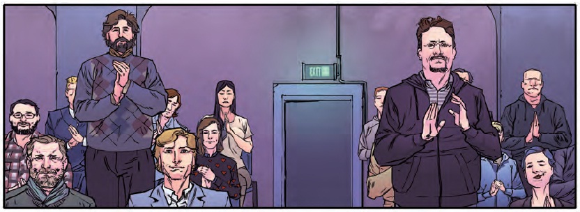 En la próxima escena, la perspectiva del lector cambia porque se da a entender que, en realidad, serían actores que llevan meses ensayando una obra que tienen de inminente estreno.