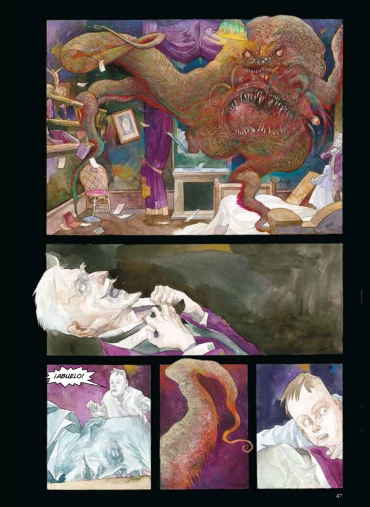Teniendo una edición en Inglés (la cuál seguramente sea puesta en venta por contar con esta maravilla nacional), les digo que esta versión no tiene nada que envidiarle. Es más, la supera. La saturación de los colores es excelente, la traducción impecable. No hay mucho que agregar excepto seguir festejando que Hotel de las Ideas nos presente material de tan alta calidad y que nos traiga una versión nacional con arte de nuestro Enrique Breccia, un autor imprescindible con un gran faltante en nuestras tierras y bibliotecas. Siempre, de mi parte, se agradece más del inmenso Enrique.