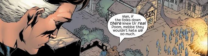 Aunque los Latverianos adoraban a Doom, y tienen excelente nivel de vida, y todos tienen trabajo, y nadie pasa hambre, y hay salud y educación para todos… hay algo que no tienen, y que los norteamericanos sí: LIBERTAD. Eso nos dice el guionista, y es lo más importante. Además, los años de control mental publicitario que sufrieron los hace incapaces de controlar su propio destino, ya que tienen el cerebro lavado. Desde su retórica imperialista siniestra, Waid está justificando cualquier intervención militar norteamericana en el resto del mundo, ya que solo ellos saben lo que es mejor para el resto. No hay interés ni necesidad de escuchar lo que opinan los habitantes del país. Al final del arco, Waid dice que Reed esta “entrenando Latverianos para volverlos políticos”, explicando que algún día, con suficiente adoctrinamiento norteamericano, los Latverianos podrán manejarse por sí solos.