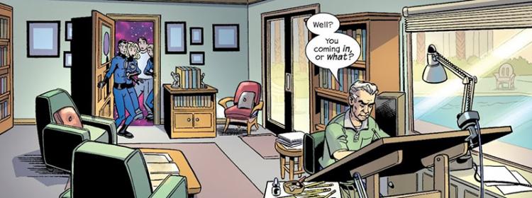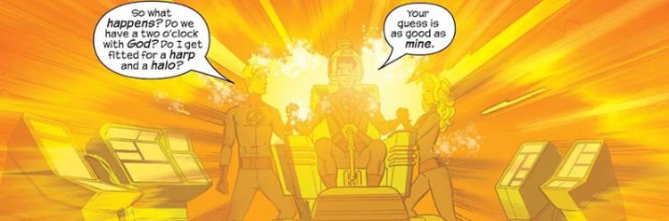 Hereafter es la culminación de todos los malos hábitos de Waid. La historia es muy breve y esta ridículamente estirada en tres números, dándonos muchas splashepages (páginas dobles)y relleno “cinemático” del que tanto criticaba antes. El concepto es prácticamente ofensivo a la propuesta original del autor, ya que en lugar de ir a lugares nuevos es una oda al regreso al statu quo y a la falta de impacto de las muertes en los comics de superhéroes modernos. Reed literalmente conoce a Dios y resetea dicho statu quo mágicamente. Es un escupitajo a Kirby y lo que representaba su era en el título. Pero analicémoslo con más detalle.