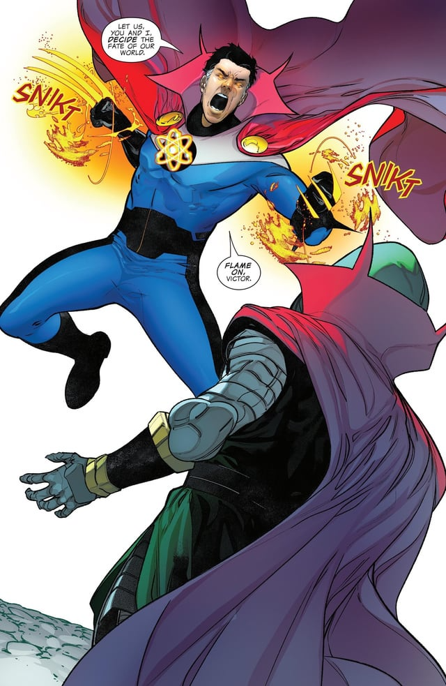 Pobre Reed, se la pasó estudiando y aprendiendo hasta autoproclamarse científico supremo con capa incluida, para que Doom le dé una paliza tremenda, sacándolo del plano astral para, sin la más mínima piedad, prenderlo fuego. No pega una Mr Fantastic.