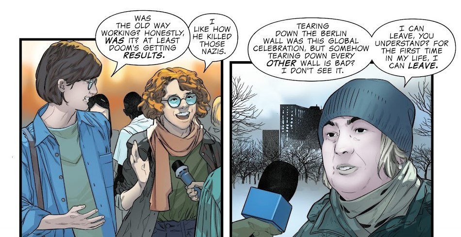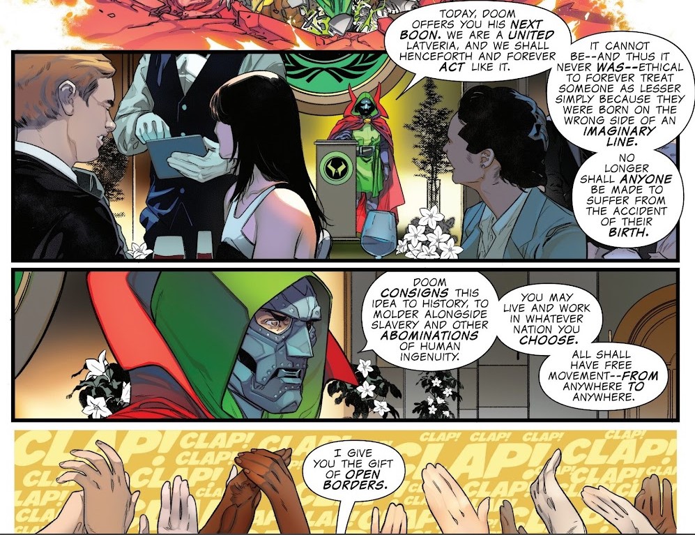 Si el número anterior había arrancado fuerte, acá la cosa no se detiene ni baja la intensidad, Doom sigue varios pasos por delante de todos, la gente de a pie se va sintiendo más segura con los cambios que se van produciendo, los Avengers planeando estrategias de fondo tratando de llevar la pelea a su terreno, los villanos (generalmente ignorados en este tipo de eventos) diciendo presente… y seguramente más gente seguirá llegando al baile.