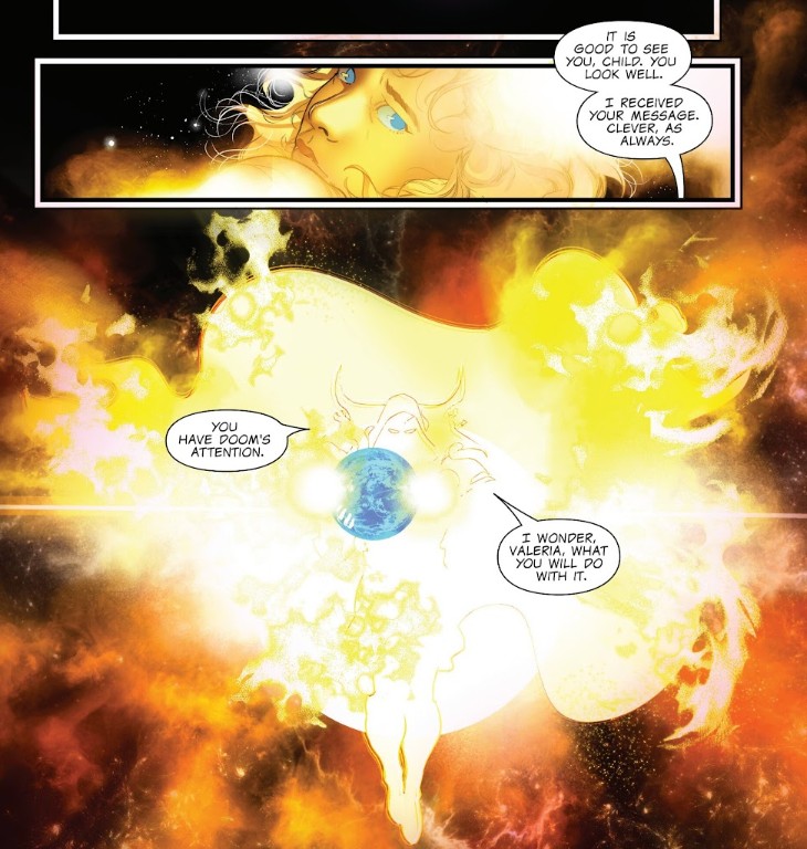 Llevada al plano astral en donde podrán hablar a solas pero por poco tiempo, Valeria quiere que Doom se detenga. Ya no hay gloria en esto. Con el mundo en su contra, ¿cuándo se detendrá esta sucesión de batallas cada vez más violentas? Victor sabe cómo terminará, con su victoria total e indiscutible, que el mundo terminará aceptando que él es el mejor para dirigir. Le dice a Valeria que continúe mirando la batalla para que le quede claro. Y antes de que Val pueda seguir con la conversación, Doom corta la conexión. Ella cree que si habla un poco más con él, podrá convencerlo de parar todo esto.
