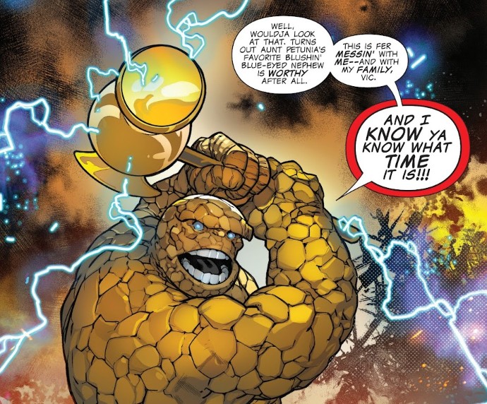De vuelta al campo de batalla, Maria Hill sigue liderando la ofensiva con estrategias nunca vistas de los héroes, en este caso combinando los poderes de Storm de los X-Men y Johnny de los 4F (se crea un huracán de fuego). Como si eso fuera poco, los rayos de Iron Man y Cyclops son puestos en un loop por Invisible Woman. Nada de eso es suficiente, a los ataques se suman Iceman y Beast, pero para Victor todo ese esfuerzo es en vano y siente que ya es hora de terminar con todo esto, usando magia del caos (la misma que usa The Scarlet Witch). Anula el gen X, todos los mutantes pierden sus poderes (será solo de manera temporal y en cuanto abandonen el lugar los poderes volverán), la victoria se siente cercana para Victor hasta que… Squirrel Girl logra sujetarlo, apenas una molestia para el emperador Doom… pero lo distrae lo suficiente para que un agónico Reed dirija cada rayo de energía de los héroes hacia el Stormbreaker, el martillo de Ray Beta Bill. El buen Ben Grimm, nuestro querido The Thing, demuestra ser digno para levantar el martillo y darle a Doom un golpe definitivo. ¿Definitivo? Estamos hablando del Emperador Doom, el hechicero supremo, el rey de Latveria, el protagonista absoluto de esta historia. Usando prácticamente toda su magia restante, la armadura de Doom estalla en millones de fragmentos, cada uno de ellos está imbuido en energía, que lastima lo suficiente a cada héroe. Como si eso no fuera suficiente y para asegurar que su victoria sea eterna, hizo del momento un punto fijo en el tiempo, el momento de su mayor triunfo que nada ni nadie podrá cambiar.