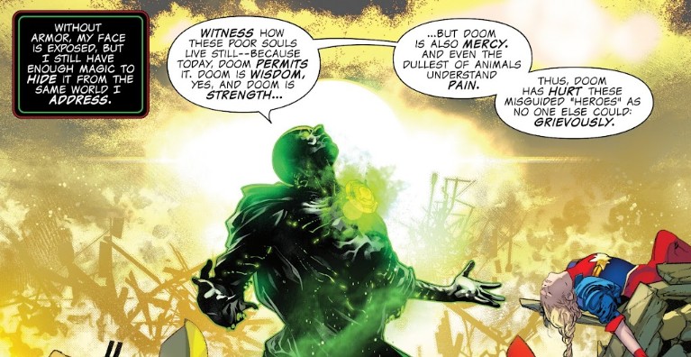 *Momento Doom:Solo Doom puede salvarte, el fin justifica los medios, todo tiene un costo. Frases que Victor dijo a Reed Richards en su momento para dejar en claro que él como salvador era la mejor opción, que lo que haya que sacrificar para salvar el mundo lo vale, no importaba cuántas vidas se perdieran por el camino. Antes le había dicho a Valeria que buscaba la gloria, que quedara claro que el es el mejor de todos nosotros. ¿Seguirá sosteniendo esas palabras en el próximo número?