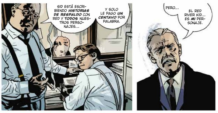El guion ofrece varios puntos interesantes, pero debemos empezar por el diseño del título, con una tipografía dentro de otra, reflejando la idea de una historia dentro de otra. Las vidas de Red River Kid y la de Max Winters (y la experiencia de Brubaker si uno quiere) se entrecruzan, reforzando los dos relatos un poco por las diferencias, pero mucho más por las cosas en común. Winters deseaba darle a su personaje un final felíz, pero el editor no se lo permite, y con eso arruina el final de ambos, dejando ese destino en manos de otro.