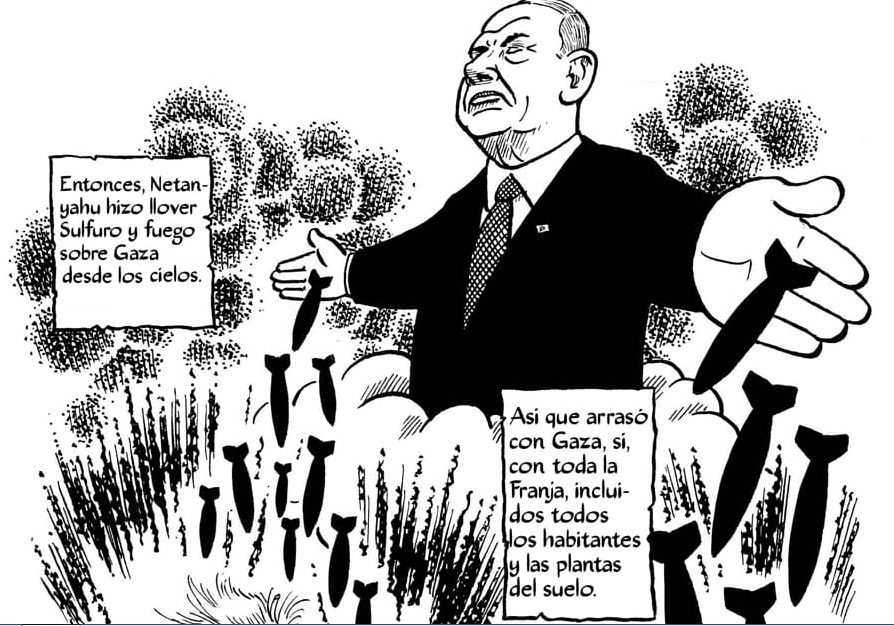 El material que se recopila en este librito está compuesto de algunas ilustraciones a página completa y de algunas historias de entre dos y cuatro páginas. Cada una está profundamente atravesada por la subjetividad del autor, por su posición política y ética ante el genocidio pero también por ser un artista que reside en los Estados Unidos (un actor esencial en el conflicto) desde hace décadas.