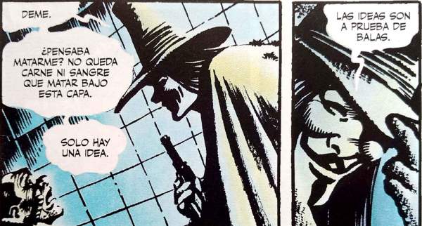- El concepto de ideas es bastante importante, es lo que motiva a los protagonistas. Nada más ni nada menos que Platón y Aristóteles han hecho sus ensayos más significativos sobre metafísica. Los conceptos de Ideas (Platón) y de Esencias (Aristóteles) como algo invisible, perfecto e incorruptible que trasciende la materia tiene ya larga data. Concretamente, V habla de su investidura y su máscara como una idea que puede devenir en algo de menor relevancia si se llegara a conocer su identidad bajo la capa, es decir, si no tiene ese tinte de trascendencia.